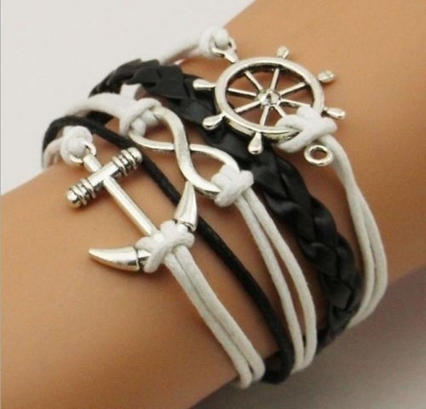 Якорь, штурвал, морской узел и застежка серебряного цвета.