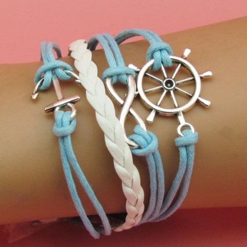 Изящный браслетик в морском стиле с якорем и штурвалом в голубых тонах.