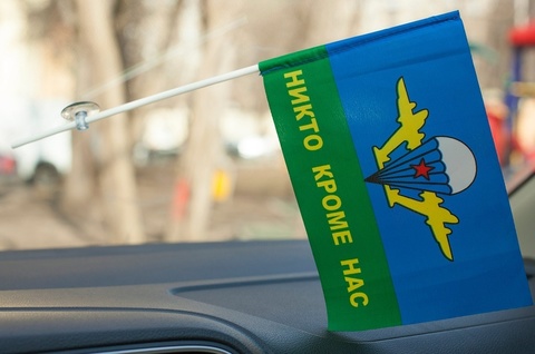Флаг ВДВ СССР на присоске с легендарным девизом "НИКТО КРОМЕ НАС" и белым куполом идеален для размещения в салоне автомобиля.