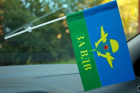 Флаг ВДВ на присоске с девизом "ЗА ВДВ!" идеален для размещения в салоне автомобиля.