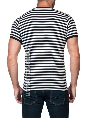 Футболка-тельняшка имеет черные полосы. По горловине и рукавам окантовка.