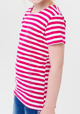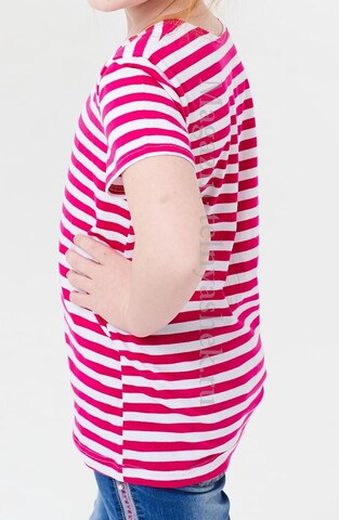 Футболка-тельняшка для девочки имеет ярко-розовые полосы.