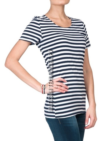 Женская футболка-тельняшка с темно-синей полосой, приталенным силуэтом и коротким рукавом отлично подойдет для прогулок в жаркий летний день, ведь футболки связанные из полотна кулирная гладь пропускают воздух, хорошо отводят влагу от тела и позволяют ему дышать!