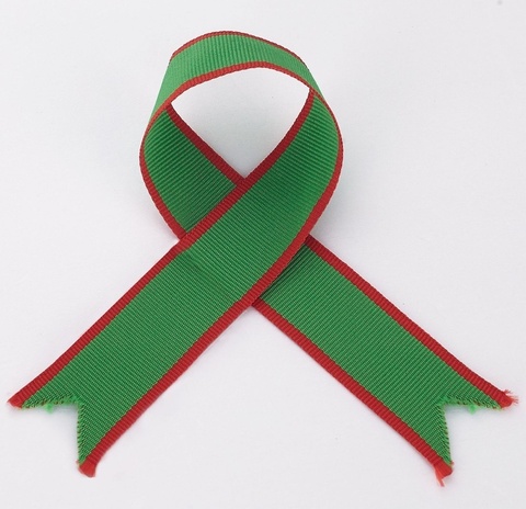 Текстильная лента зеленого цвета с красными полосками по краям.