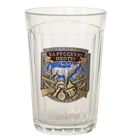Граненый стакан традиционной формы с барельефом с изображением лося и надписью "За русскую охоту!"