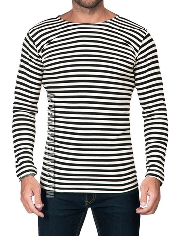 Черная тельняшка связана из нитей двух цветов, одинаковая снаружи и внутри (а не крашенная сверху!).
