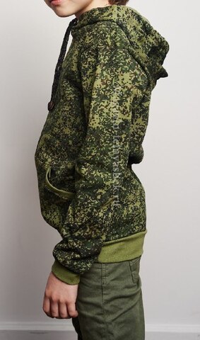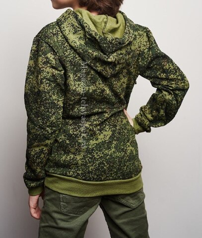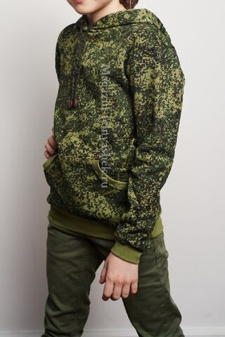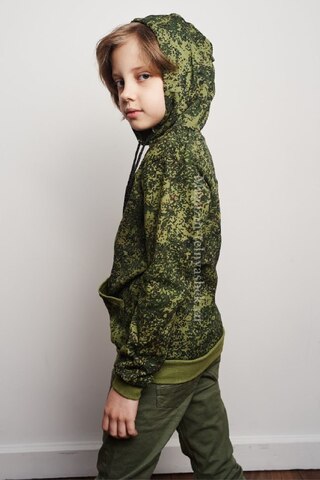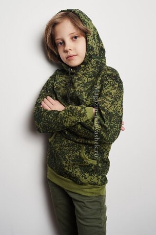 Мягкий джемпер для детей камуфлированный с рисунком "цифра" зеленого цвета из трикотажного полотна.